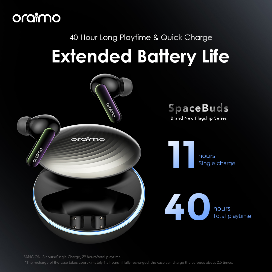 اختبر الهدوء التام كما في الفضاء مع تكنولوجيا إلغاء الضوضاء الهجينة المتقدمة من oraimo التي تقضي على التشويش بسهولة وتوفر تقليل ضوضاء يصل إلى 50dB. استمتع بموسيقاك المفضلة وركز فقط على الصوت الذي يهم.