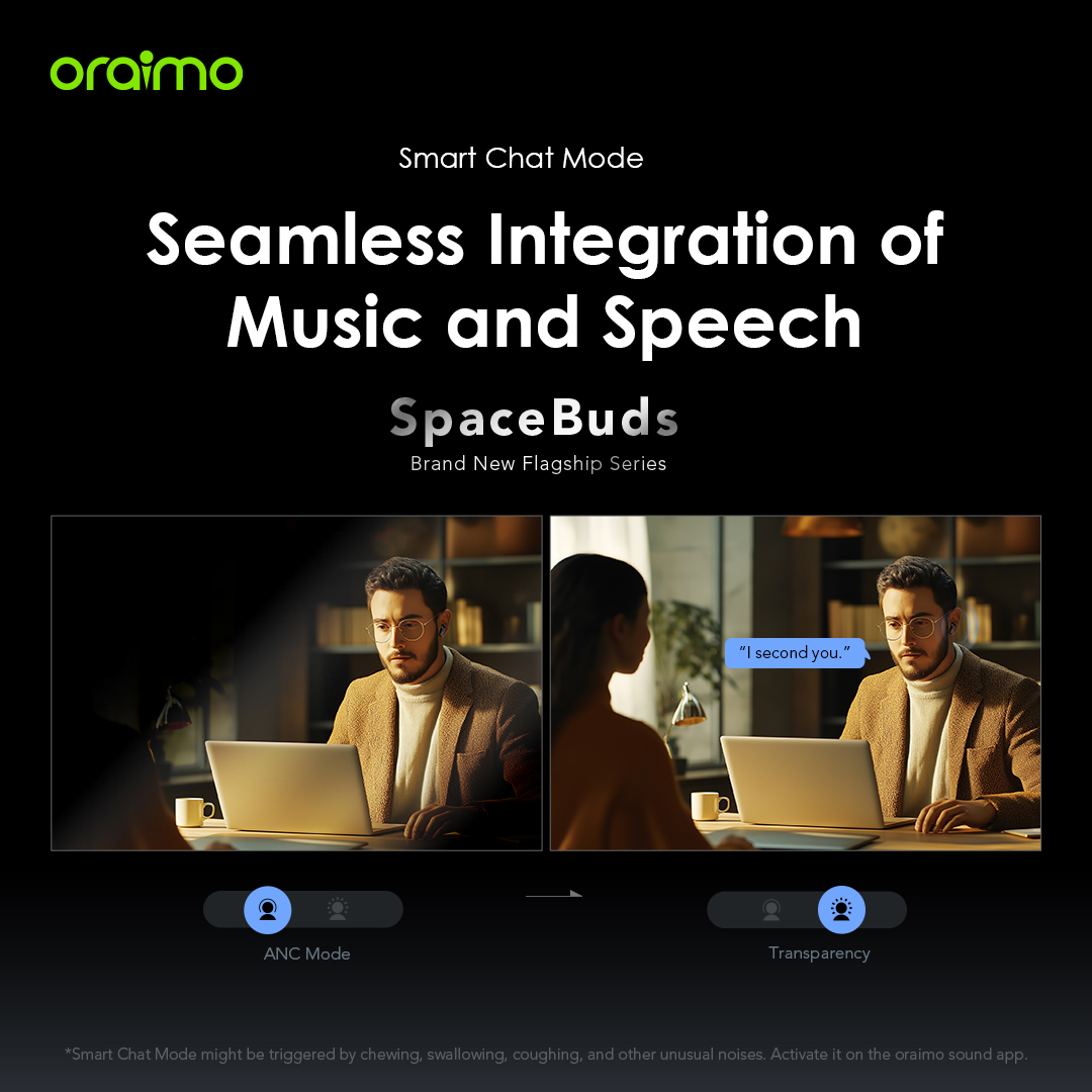 سوف تتحول SpaceBuds تلقائيًا إلى وضع الشفافية وتتوقف عن تشغيل الموسيقى عند اكتشاف صوتك. مثالي للمتعددين المهام، يمكنك المشاركة بسهولة في المحادثات دون إيقاف الموسيقى.